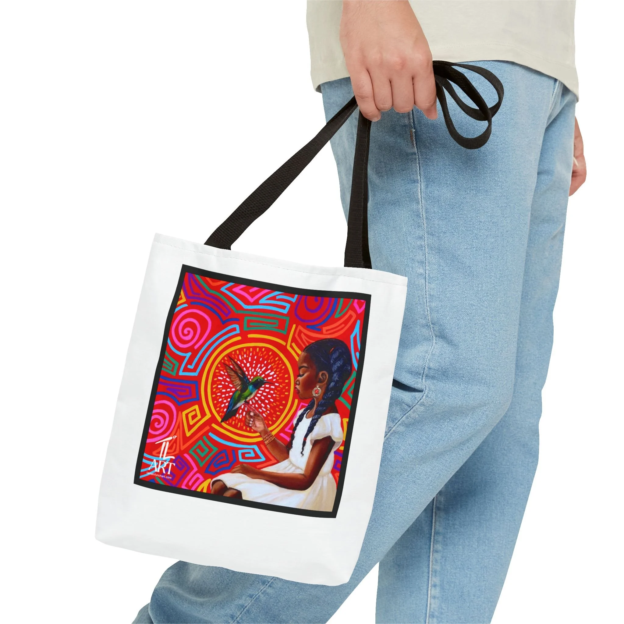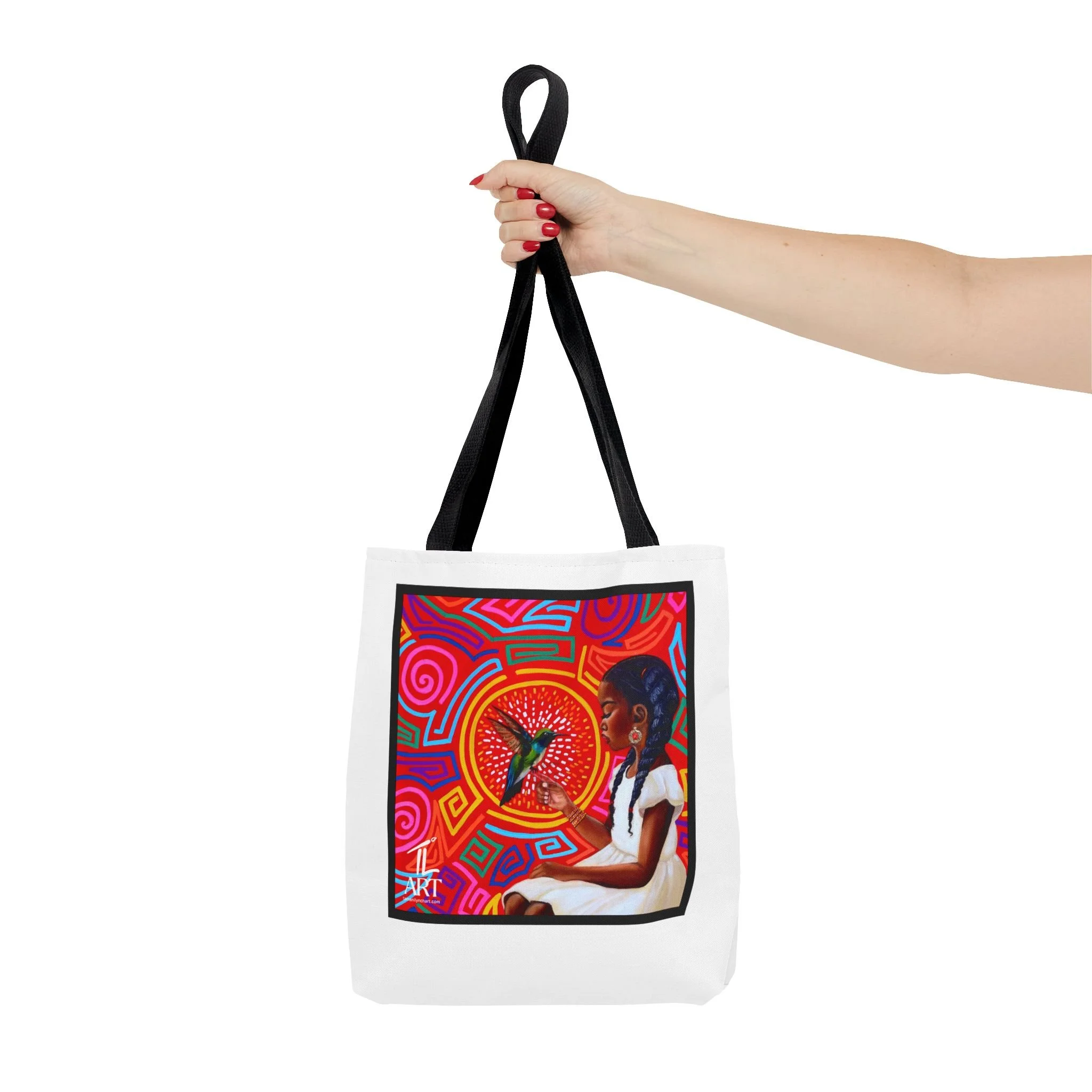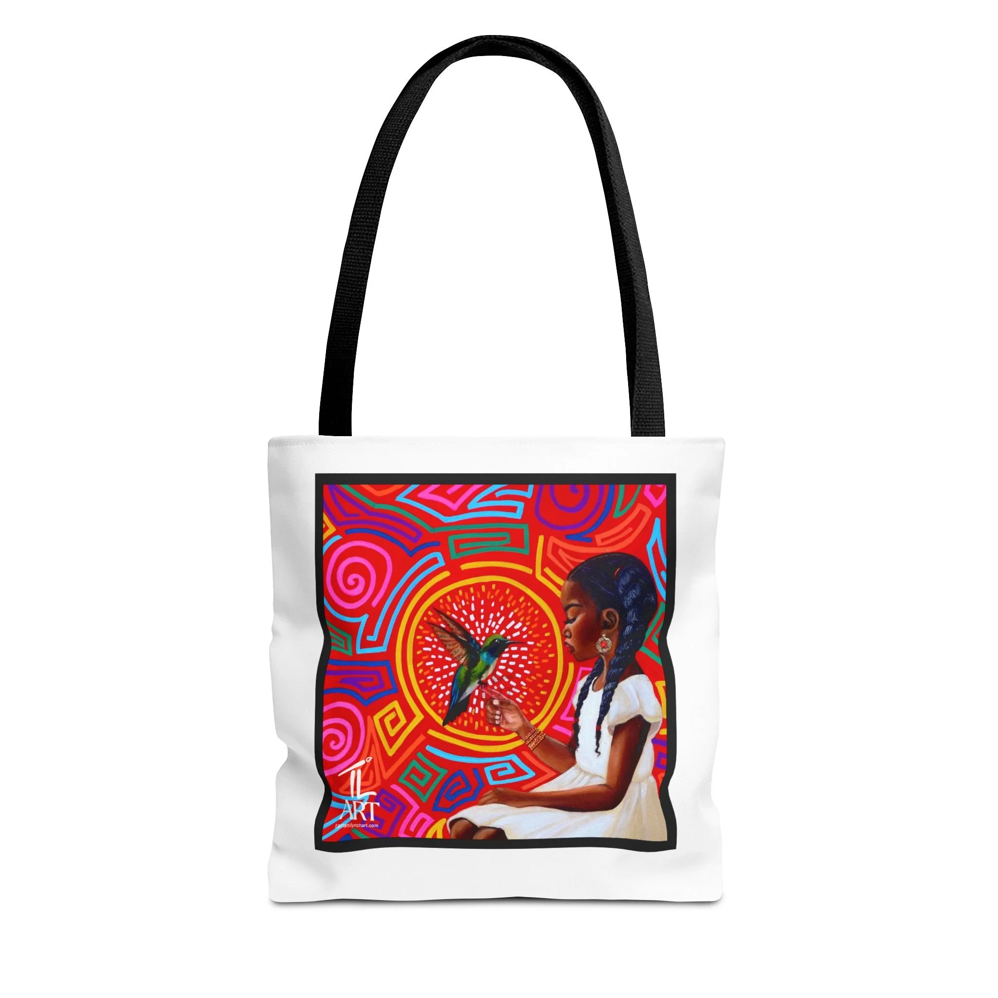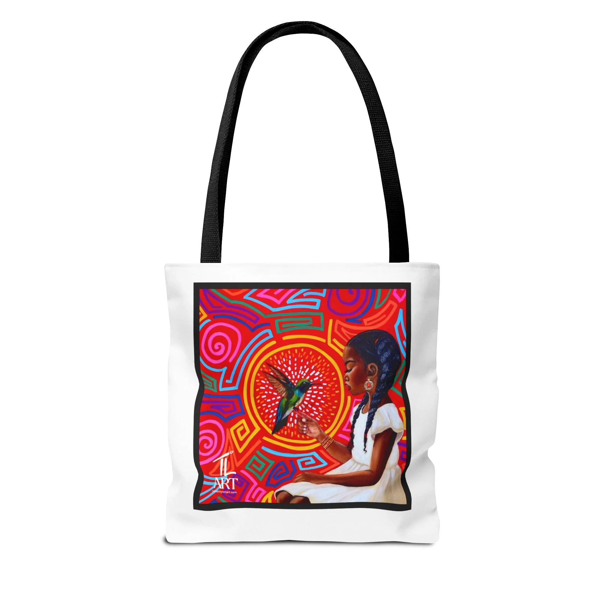 This vibrant tote bag features original artwork by T. Lynch, blending bold Panamanian-inspired mola patterns with a striking portrait that celebrates identity, heritage, and quiet strength. At the heart of the piece, a young Afro-Latina girl gazes toward a radiant hummingbird—symbolizing resilience, beauty, and ancestral connection.